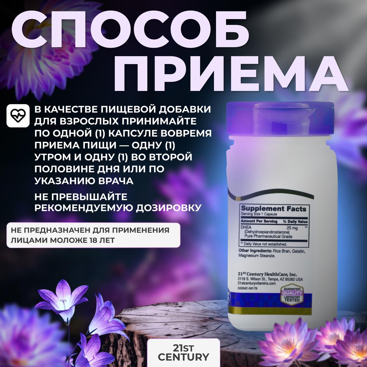 ДГЭА 90 капсул ✓ Для улучшения здоровья и качества жизни 25 мг ✓ Пищевая добавка ✓ Без глютена ✓ Не содержит ГМО ✓ Заслуживающее доверия качество более 30 лет ✓ Гарантированное качество Продукт прошёл лабораторные испытания DHEA (дегидроэпиандростерон) — это гормон, вырабатываемый надпочечниками, который поддерживает гормональный баланс в организме. ● Рекомендации по применению: В качестве пищевой добавки взрослым принимать по одной (1) капсуле дважды в день (1 утром и 1 раз в день) во время любого приема пищи или в соответствии с рекомендациями врача. Не превышайте рекомендуемую дозировку. Результаты зависят от индивидуальных особенностей организма.