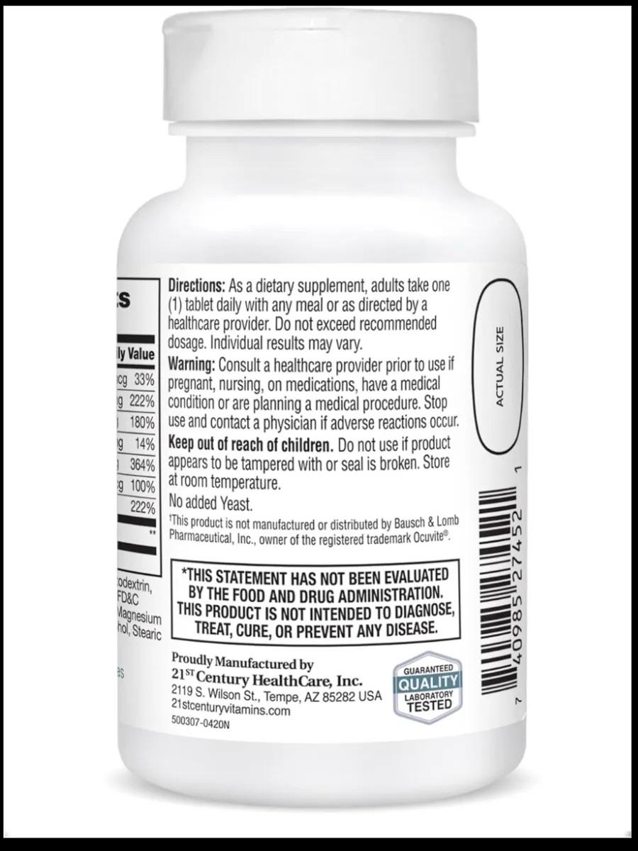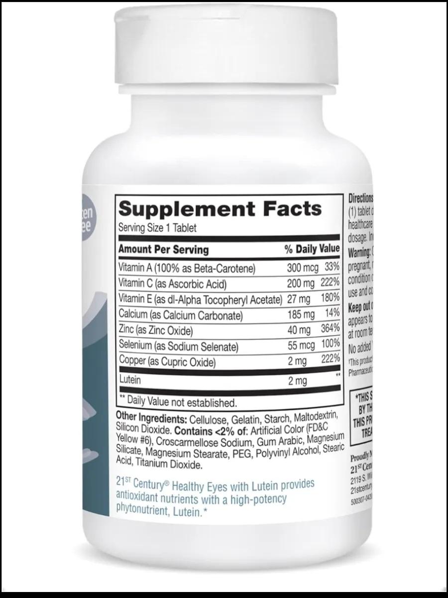 Без ГМО Без глютена Добавка с витаминами и минералами для здорового зрения Сравните с Ocuvite® с лютеином† Не содержит добавленных дрожжей Гарантированное качество — продукт прошёл лабораторные испытания Заслуживающее доверия качество более 30 лет Добавка для здоровья глаз Healthy Eyes с лютеином от 21st Century® содержит антиоксидантные питательные вещества и 2 мг лютеина для поддержки здоровья глаз. Рекомендации по применению В качестве пищевой добавки для взрослых принимать по одной (1) таблетке в день во время любого приема пищи или в соответствии с назначением врача. Не следует превышать рекомендованную дозировку.