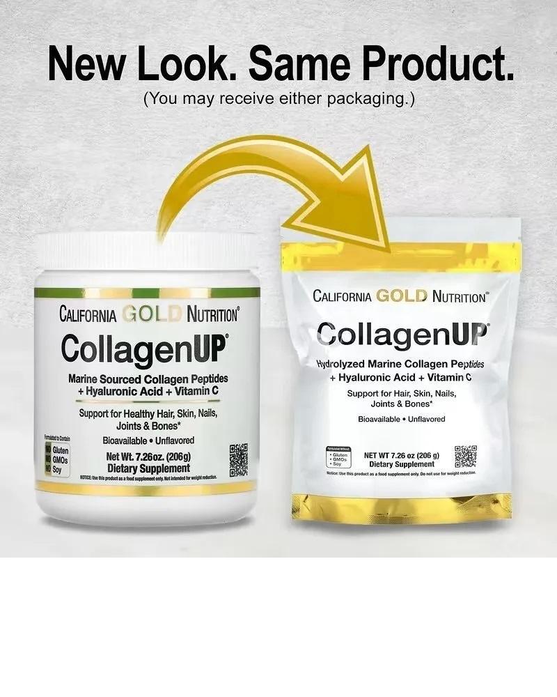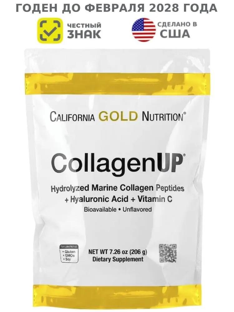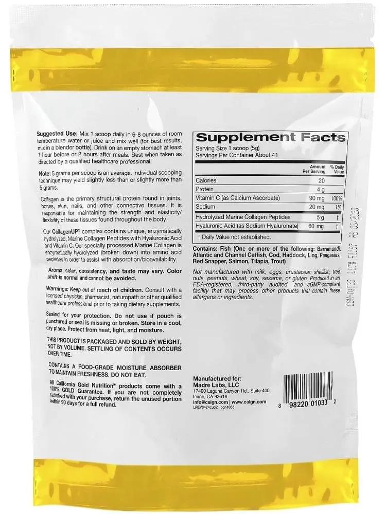 CollagenUP® Гидролизованные пептиды морского коллагена с гиалуроновой кислотой и витамином C, с нейтральным вкусом, 206 г. CollagenUP (206 г) от California Gold Nutrition Пептиды морского коллагена, гиалуроновая кислота и витамин C. ✓ Содержит гидролизованный рыбий (не бычий) коллаген без вкусовых добавок. ✓ Содержит гиалуроновую кислоту и витамин C неживотного происхождения. ✓ Поддержка здоровья волос, кожи, ногтей, суставов и костей. ✓ Гидролизованный ферментативным способом коллаген, расщеплённый на биодоступные пептиды. ✓ Не содержит глютена, ГМО и сои. Производится на предприятии, которое имеет регистрацию текущей надлежащей производственной практики (cGMP) и проходит независимые проверки. Гарантия 100% Gold Guarantee. Теперь в пакете многоразового использования для удобного хранения Коллаген, гиалуроновая кислота и витамин C способствуют здоровью и нормальному функционированию опорно-двигательного аппарата. ● Рекомендации по применению: Добавьте 1 мерную ложку порошка в 180–240 мл (6–8 жидк. унций) воды или сока комнатной температуры и хорошо перемешайте (для достижения наилучших результатов перемешайте в блендере). Принимайте каждый день. Пейте натощак, по крайней мере за 1 час до или через 2 часа после еды. Рекомендуется принимать в соответствии с назначением квалифицированного медицинского работника. Примечание: 5 г в одной мерной ложке — среднее значение. Фактически 1 мерная ложка может вмещать немного меньше или немного больше, чем 5 г.