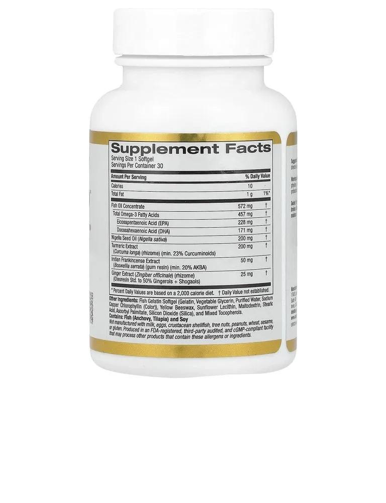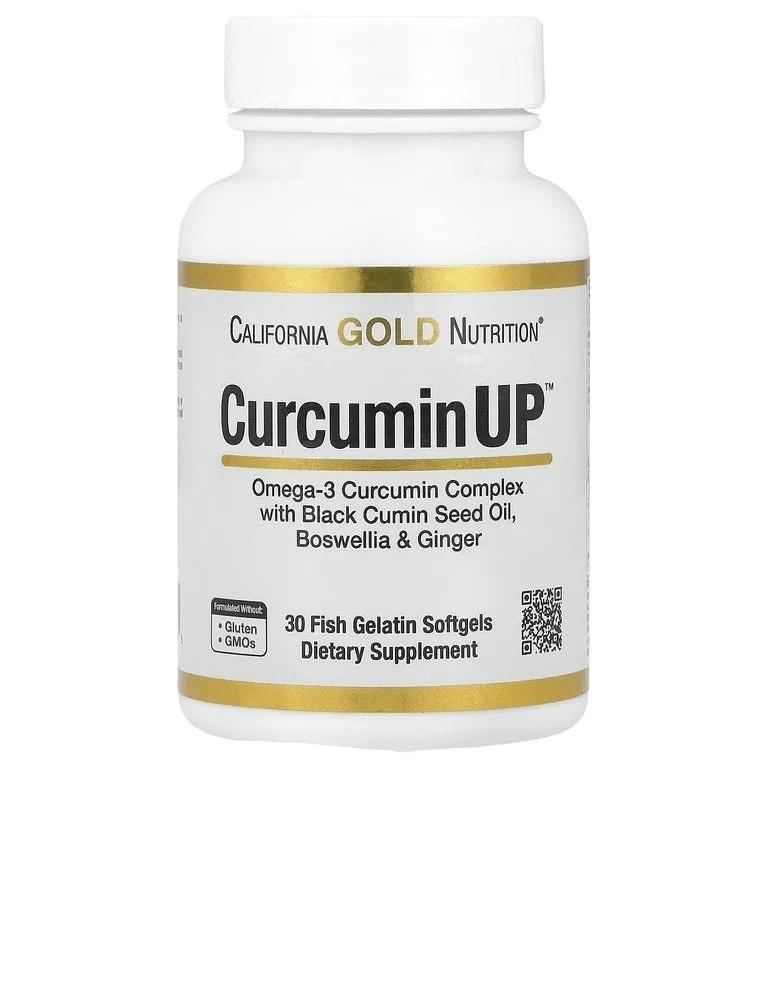 Комплекс с омега-3, куркумином, маслом из семян чёрного тмина, босвеллией и имбирём Не содержит глютена и ГМО Поддерживает подвижность и комфорт в работе суставов* Производится на предприятии, которое имеет регистрацию текущей надлежащей производственной практики (cGMP) и проходит независимые проверки Гарантия 100% Gold Guarantee CurcuminUP™ от California Gold Nutrition® — это улучшенное средство для поддержки нормальной воспалительной реакции с концентратом рыбьего жира, содержащее омега-3 жирные кислоты, масло из семян чёрного тмина, экстракты куркумы, босвеллии и имбиря в капсулах из рыбьего желатина. Рекомендации по применению Принимать по 1 капсуле в день во время еды. Рекомендуется принимать в соответствии с назначением квалифицированного медицинского работника.
