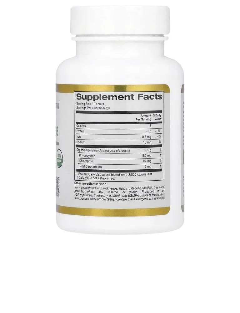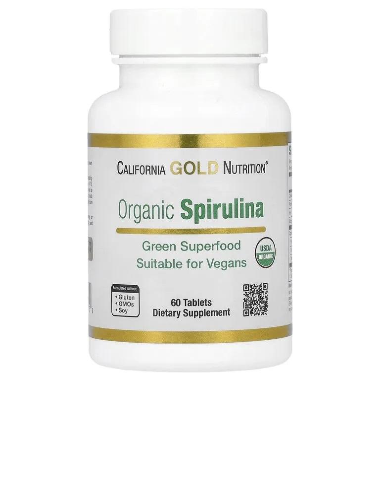 Спирулина — это разновидность сине-зелёных водорослей (Arthrospira platensis), которая содержит множество полезных соединений. Органическая спирулина от California Gold Nutrition® содержит органическую сертифицированную USDA Organic форму этого зелёного суперфуда, которая обеспечивает антиоксидантную поддержку*. Преимущества спирулины Сине-зелёные водоросли считаются зелёным суперфудом, поскольку содержат множество полезных питательных веществ. Одним из таких питательных веществ является мощный растительный белок фикоцианин — пигмент, придающий спирулине сине-зелёный цвет. Фикоцианин может обладать антиоксидантными свойствами, а также укреплять иммунитет*. Спирулина также содержит хлорофилл, который способствует выработке эритроцитов и помогает защитить организм от токсинов. Рекомендации по применению Принимать по 3 таблетки в день, независимо от приема пищи. Рекомендуется принимать в соответствии с назначением врача.
