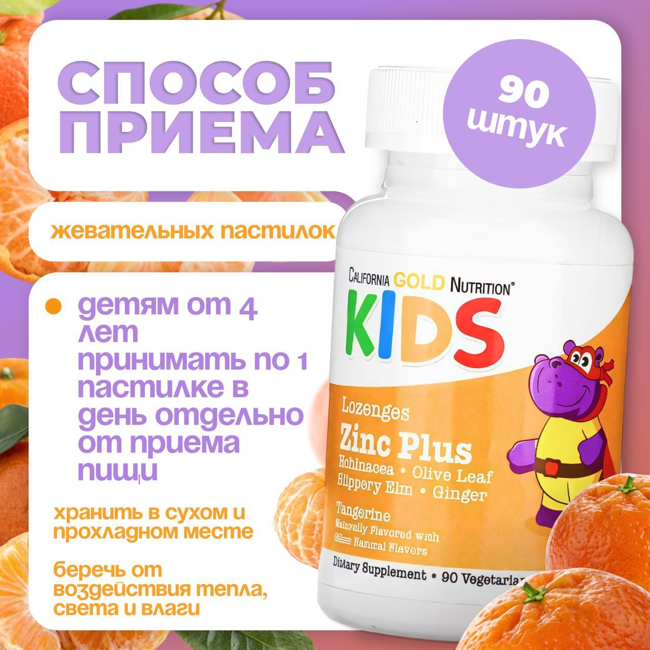 Со вкусом мандарина Добавка содержит хелатный цинк, эхинацею, листья оливы, красный вяз и имбирь Вегетарианский продукт Без искусственных красителей и консервантов Пастилки Zinc Plus от California Gold Nutrition® Kids — это интересный и вкусный способ сохранить здоровье ваших детей благодаря полезной смеси цинка и трав для поддержки иммунной системы и общего состояния здоровья*. Сертификат качества iTested Рекомендации по применению Детям от 4 лет принимать по 1 пастилке в день отдельно от приема пищи. Рекомендуется принимать в соответствии с назначением квалифицированного медицинского работника. Убедитесь, что ребенок тщательно рассасывает пастилку.