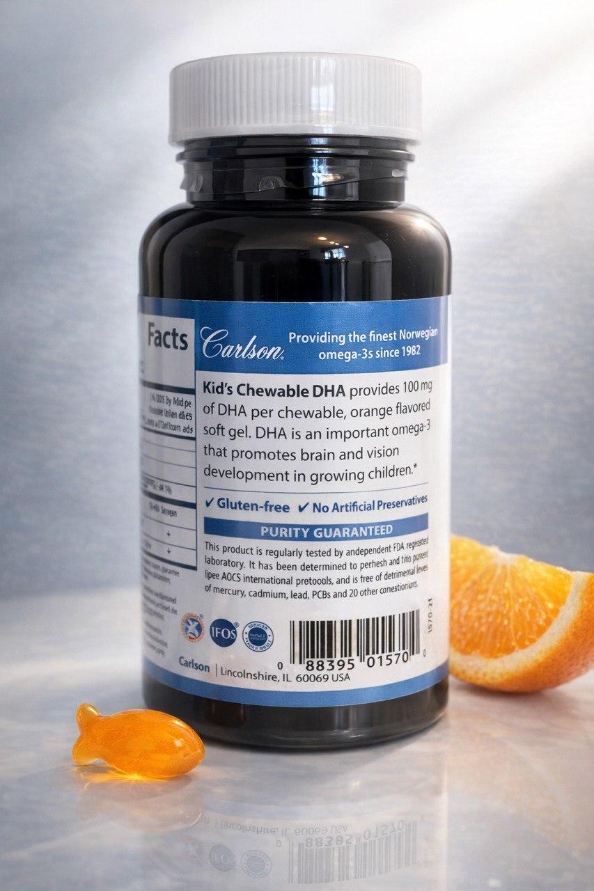 Отсутствие ГМО в составе подтверждено сертификатом Igen™ Non-GMO Tested Чистота, свежесть и эффективность гарантированы Пищевая добавка Здоровье мозга Поддержка зрения Рост и развитие Без глютена Не содержит искусственных консервантов Участник программ Impact Collective — снижение загрязнения пластиком IFOS™ Сертификат Friend of the Sea Предприятие подотчетно Управлению по контролю качества пищевых продуктов и лекарственных средств США (FDA) Лучшие препараты, содержащие омега-3 кислоты, из Норвегии. Детская жевательная ДГК содержит 100 мг ДГК в одном жевательном мягком геле со вкусом апельсина. ДГК - это важная омега-3, которая способствует развитию мозга и зрения у растущих детей. Чистота гарантирована Этот продукт регулярно тестируется в независимых лабораториях, зарегистрированных Управлением по контролю качества пищевых продуктов и лекарственных препаратов США (FDA). Его свежесть, максимальная эффективность (согласно международным протоколам AOCS) и отсутствие вредных концентраций ртути, кадмия, свинца, ПХБ и 28 других загрязняющих веществ гарантированы. Рекомендации по применению Дети от 4 лет: разжевывать один или два раза в день во время еды.