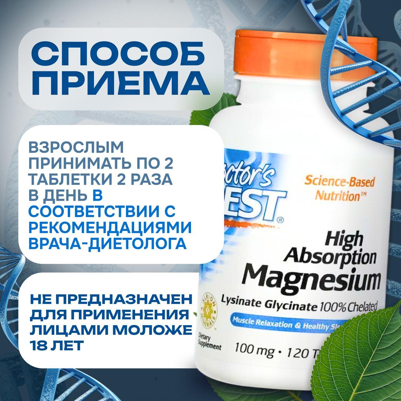 Science-Based Nutrition™ Лизинат и глицинат Полностью хелатная форма Расслабление мышц и поддержка сна Albion® Minerals Пищевая добавка Без ГМО Без глютена Не содержит сои Веганский продукт Магний с высокой усвояемостью от Doctor's Best помогает справляться с различными задачами и отвечает за многие функции организма. Наша специализированная формула с магнием обеспечивает необходимую поддержку здоровья мышц, нервной системы, качества сна и хорошего настроения. Магний необходим для работы 600 ферментных систем, поддерживающих биохимические функции. Усваивается до 6 раз лучше, чем другие формы магния. Хелатная технология TRAACS® от Albion®. Рекомендации по применению Принимать по 2 таблетки два раза в день или в соответствии с рекомендациями врача-диетолога.