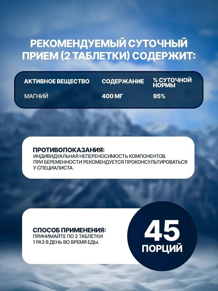 Качество, которому доверяют Компания основана в 1932 году Пищевая добавка Приём 2 раза в день Заряд энергии Не содержит ГМО Веганский продукт Без глютена Магний обеспечивает питательную поддержку для сохранения нормального, здорового уровня энергии. Технология ActivTab™ гарантирует распад таблетки в течение 30 минут согласно стандартам USP. Рекомендации по применению Принимать по 2 таблетки в день во время еды или запивая стаканом воды. Применять только согласно инструкции.