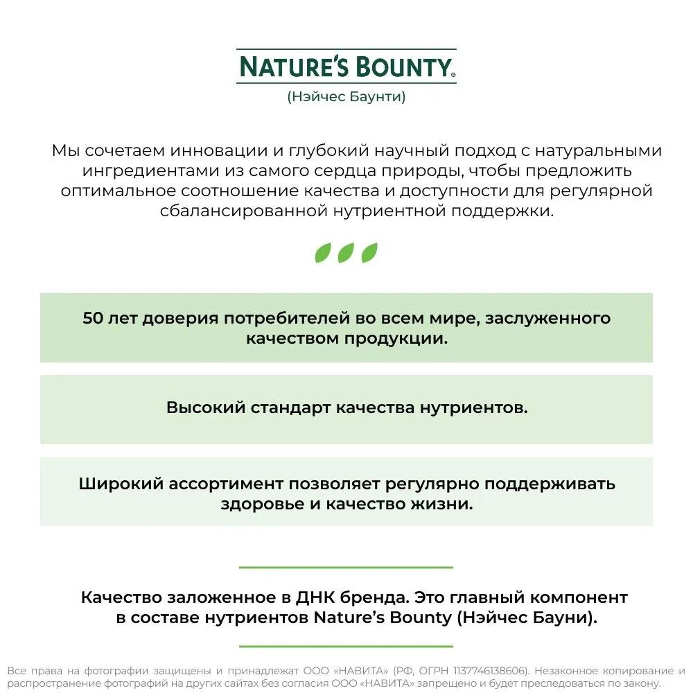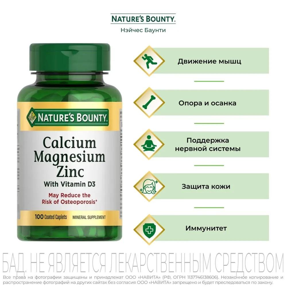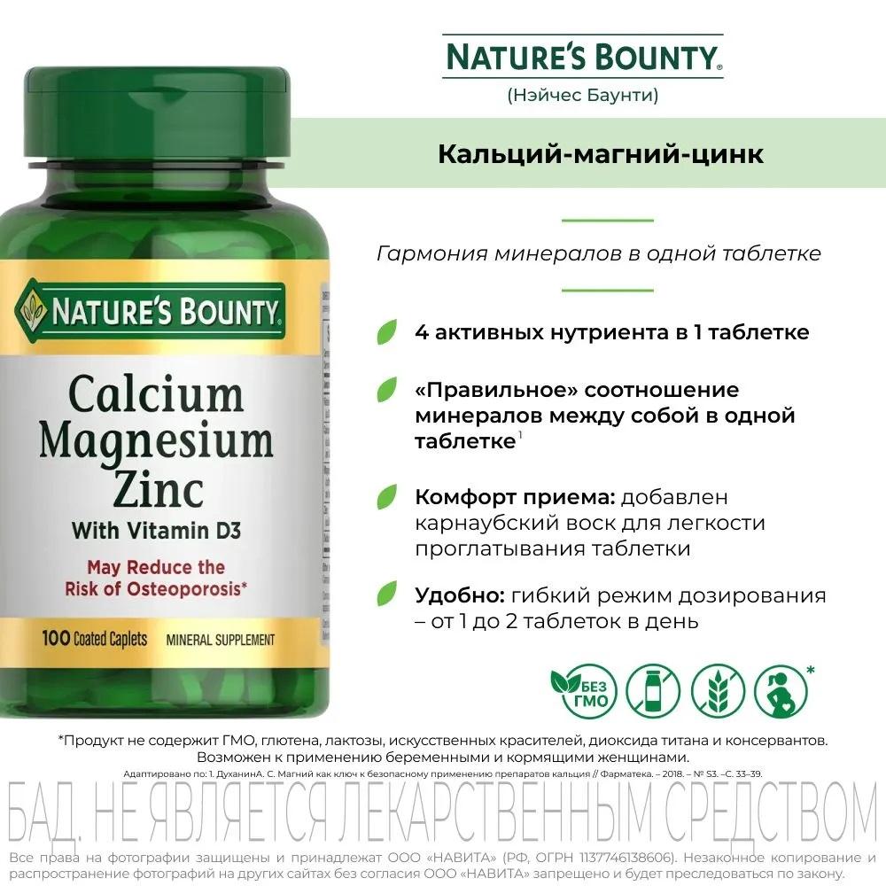 Может снизить риск развития остеопороза* Добавка с минералами Более 50 лет качества, заслуживающего доверия Компания Nature's Bounty заботится о вашем здоровье. На протяжении почти 50 лет мы производим заслуживающие доверия продукты, опираясь на научные данные и используя только самые чистые ингредиенты. Гарантировано. Таким образом, вы можете получать от жизни максимум удовольствия каждый день. Капсуловидные таблетки, покрытые оболочкой Гарантированное качество Продукт прошёл лабораторные испытания * Регулярное употребление достаточного количества кальция и витамина D в сочетании с хорошо сбалансированной диетой может уменьшить риск развития остеопороза.