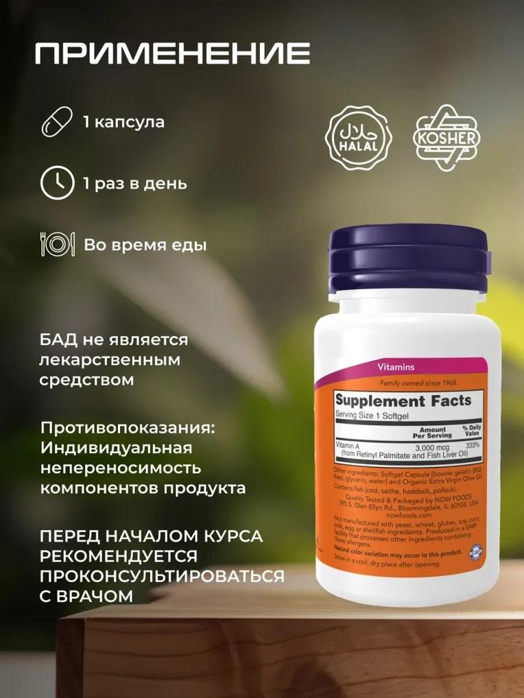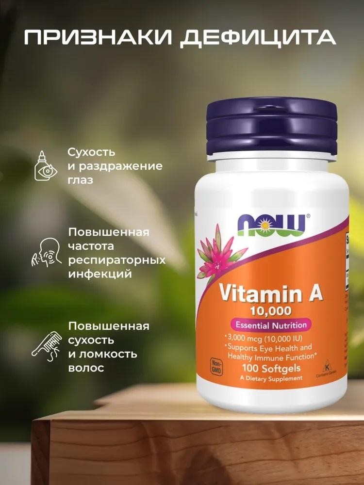 Необходимые питательные вещества 3000 мкг (10 000 МЕ) Поддерживает здоровье глаз и иммунной системы Без ГМО Пищевая добавка Кошерный продукт, содержит желатин Семейное предприятие, основанное в 1968 году Произведено на предприятии, имеющем регистрацию надлежащей производственной практики (GMP) Халяльный продукт Витамин A необходим для поддержания тканей, выстилающих внутренние и внешние поверхности тела, включая глаза, кожу, дыхательные пути, ЖКТ и мочевыводящие пути. Рекомендации по применению Принимать по 1 мягкой таблетке в день во время еды.