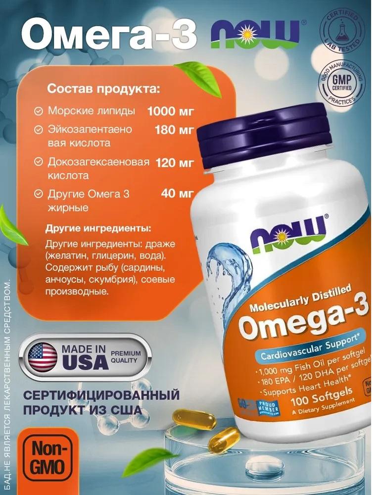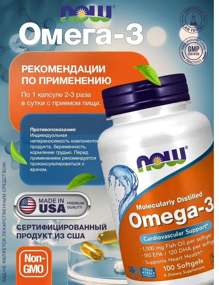 NOW Омега 3 1000мг 100 мягких капсул, Рыбий...