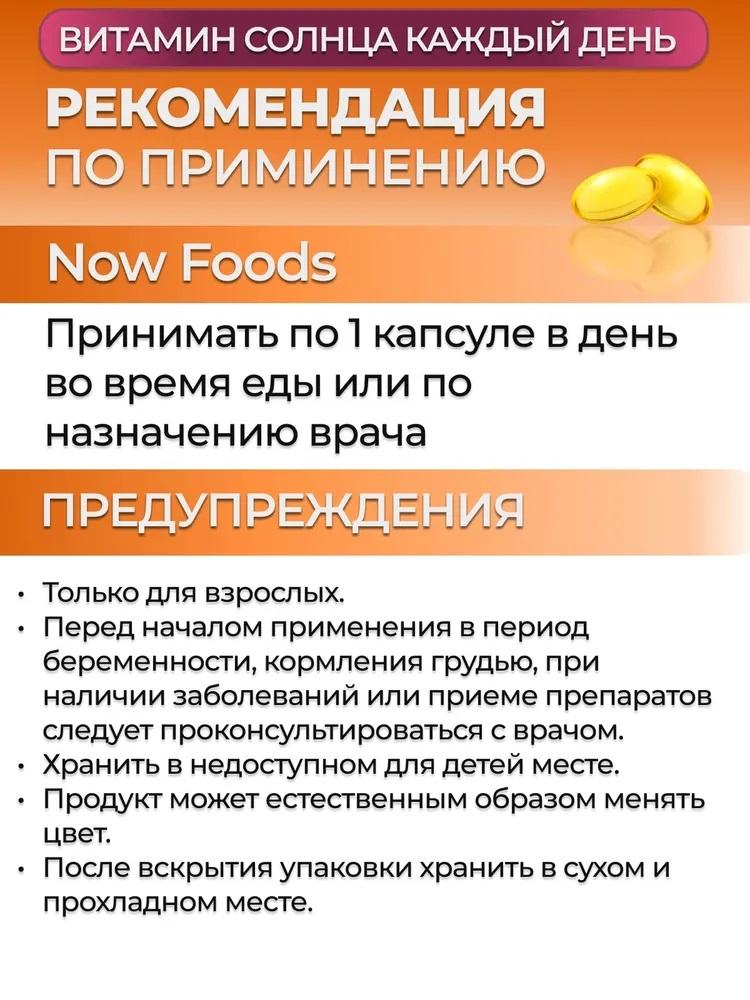 Витамин D3 в капсулах от NOW содержит этот витамин в легкоусвояемой форме. Витамин D может поступать в организм из рациона и производиться кожей, под воздействием солнечных лучей. Однако, в современном рационе этот витамин содержится в недостаточном количестве. Поскольку многие люди стремятся избегать воздействия солнца, то необходимость в дополнительном приеме витамина D становится все более насущной. NOW® Витамин Д-3 2000 МЕ обладает следующими полезными свойствами: • Поддерживает здоровье костей • Поддерживает работу иммунной системы • Улучшает работу нервной системы • Поддерживает работу сердечно-сосудистой системы Противопоказания: Индивидуальная непереносимость компонентов продукта, беременность, кормление грудью. Перед применением рекомендуется проконсультироваться с врачом. Упаковка: 240 капсул. Состав оливковое масло, мягкая желатиновая капсула, холекальциферол Способ применения Взрослым по 1 капсуле в день во время еды, запивая водой. Продолжительность приёма — 1 месяц. Возможен повторный прием в течение года.
