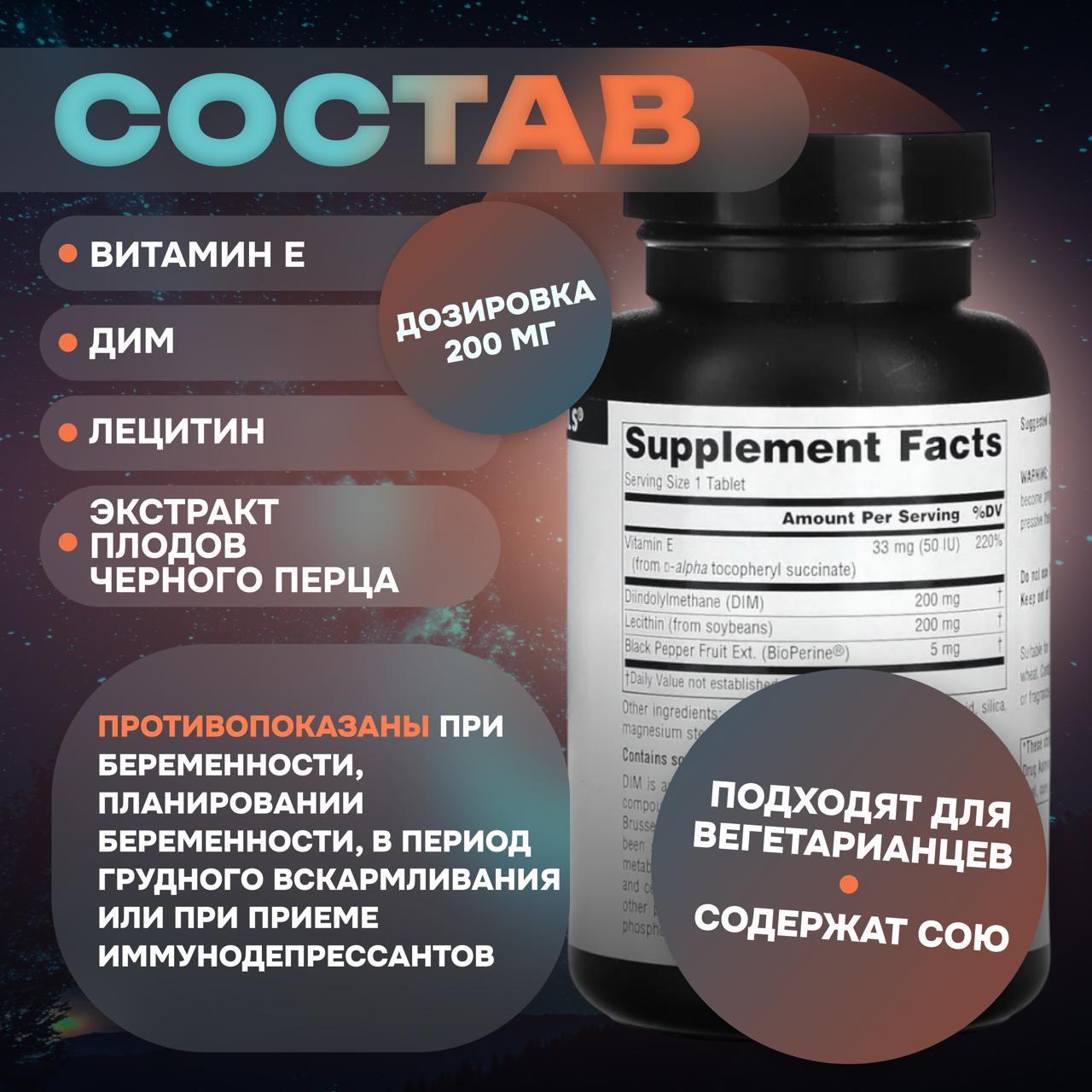 Пищевая добавка Дииндолилметан Подходит для вегетарианцев DIM — это фитохимическое вещество индол, который является натуральным метаболитом соединений, содержащихся в овощах семейства крестоцветных, таких как брокколи, брюссельская и кочанная капуста. Доклинические исследования показали, что DIM приводит к преимущественному образованию метаболитов эстрогенов, от которых зависит здоровье тканей груди, эндометрия и шейки матки. Это уникальное свойство отличает DIM от других растительных питательных веществ. Добавка DIM от Source Naturals содержит фосфолипиды, витамин E и BioPerine®. Рекомендации по применению Принимать по 1 таблетке 1–2 раза в день во время еды.