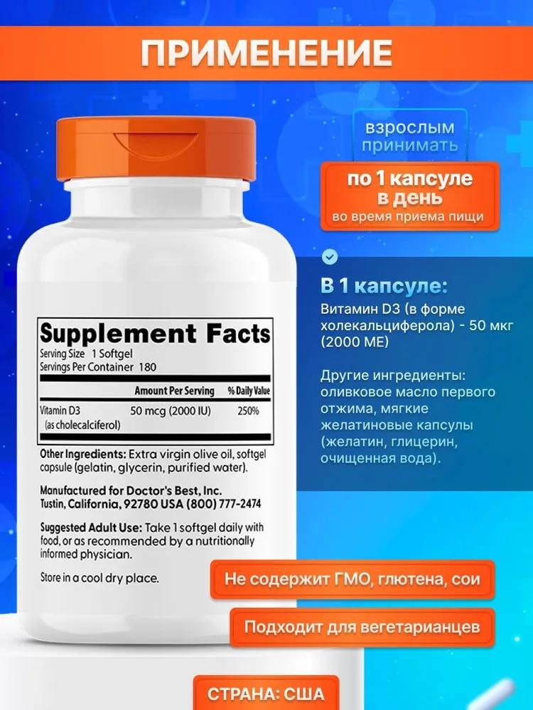 Витамин D3 от Doctor’s Best содержит холекальциферол, который необходим организму для поддержания баланса кальция и фосфора. Эти вещества важны для здоровья костей, зубов и сердца. Витамин D3 вырабатывается в коже под воздействием ультрафиолетовых лучей и в небольших количествах поступает с пищей. Недостаток витамина D3 может быть связан с защитой от солнца и климатическими условиями. Витамин D3 важен для иммунной и сердечно-сосудистой систем, а также для плотности и структуры костей. Он участвует в работе клеток и влияет на химические процессы в организме. Витамин D3 помогает регулировать уровень кальция и фосфора, необходимых для здоровья костей и зубов. Он также способствует укреплению иммунной системы и сердца. Пищевая добавка Помогает поддерживать естественные иммунные реакции, здоровье сердца и костей Без ГМО, глютена и сои Ингредиенты: Оливковое масло холодного отжима, оболочка мягкой таблетки (бычий желатин, глицерин, очищенная вода). Рекомендации по применению. Взрослым: принимать по 1 капсуле в день во время еды или в соответствии с рекомендациями врача-диетолога. Предупреждения Хранить в сухом и прохладном месте.